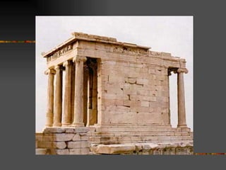 El documento describe la arquitectura griega, incluyendo las características generales de los templos griegos como la proporción y la renuncia al arco. Explica los órdenes arquitectónicos dórico, jónico y corintio y sus elementos. También resume los principales edificios griegos como el Partenón y el Erecteión en la Acrópolis de Atenas.