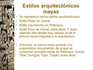 La cultura maya desarrolló varios estilos arquitectónicos monumentales como el de Petén, Usumacinta y Puuc, caracterizados por pirámides, templos, bóvedas falsas y cresterías. Uno de los centros arquitectónicos más importantes fue Tikal, con sus altas pirámides y numerosos templos. Los templos mayas solían ser de planta cuadrangular sin ventanas, mientras que las bóvedas falsas se construían acercando los muros y usando mortero de cal.