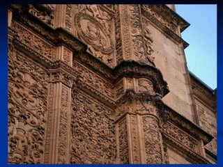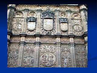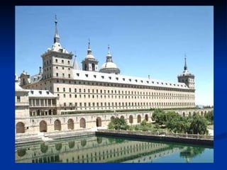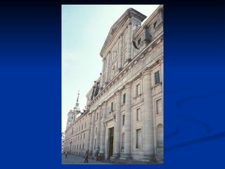 El documento describe los principales estilos arquitectónicos del Renacimiento en España durante el siglo XVI, incluyendo el Plateresco, el Clasicismo y el estilo Escurialense. Menciona arquitectos representativos como Lorenzo Vázquez, Juan de Álava, Diego de Siloe y Juan de Herrera, y sus obras más destacadas como la Catedral de Granada y el Palacio de Carlos V. También analiza elementos icnográficos y simbólicos en la planta y fachadas de este último edificio.