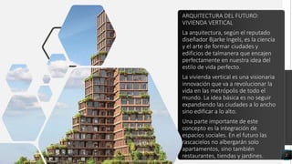 La arquitectura vertical, como propone Bjarke Ingels, busca transformar las ciudades mediante edificios altos que integren espacios sociales, comercio y naturaleza, en lugar de expandirse horizontalmente. Este enfoque responde a problemas de sostenibilidad y crecimiento urbano, promoviendo el uso eficiente del espacio y recursos. Proyectos actuales, como la torre Airali en Guatemala, ejemplifican esta tendencia con diseños que combinan vivienda, oficinas y áreas recreativas.