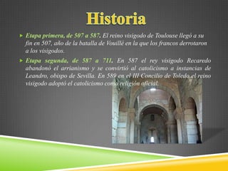 El documento resume la arquitectura visigoda en España entre los siglos VI y VIII. Explica que las iglesias visigodas tenían planta de basílica de tres naves con ábside cuadrado o de herradura, divididas por columnas. Se construían con sillería y bóvedas de medio cañón. Luego describe dos ejemplos concretos de iglesias visigodas: la Ermita de Valdecebadar con tres ábsides independientes, y Santa María de Ibahernando encargada por el obispo Orencio en el a