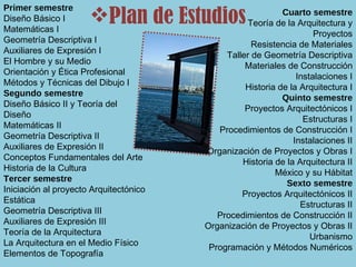 El documento presenta el plan de estudios de 9 semestres para obtener el título de Arquitecto en la Universidad UDEM en Monterrey, México. El plan incluye asignaturas como Diseño Básico, Matemáticas, Geometría Descriptiva, Historia de la Arquitectura e Ingeniería Estructural. La carrera dura entre 5 y 6 años y ofrece especializaciones como Arquitectura Paisajista e Interior. Los requisitos incluyen habilidades de organización, capacidad para el dibujo y cualidades como creatividad