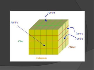 Este documento explica los conceptos básicos de arrays multidimensionales en programación. Explica que los arrays pueden tener dos o más dimensiones, y proporciona ejemplos detallados de cómo declarar y manipular arrays bidimensionales (matrices) y tridimensionales. También cubre temas como la inserción y lectura de datos, operaciones aritméticas entre matrices, y el intercambio de filas y columnas.