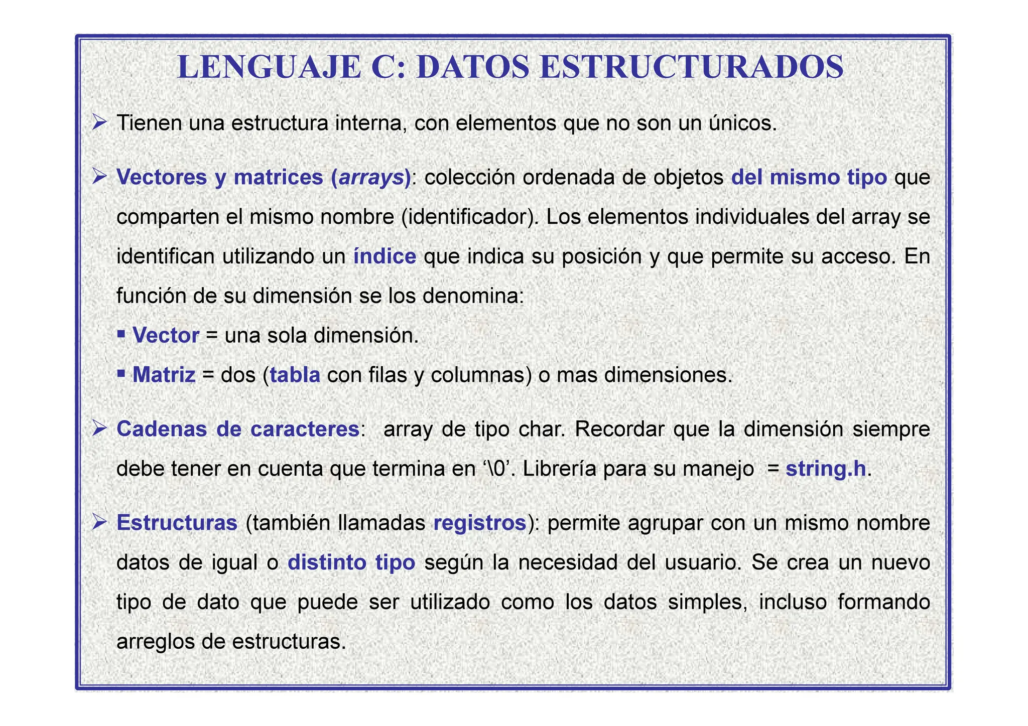 Estructuras (también llamadas registros): permite agrupar con un mismo nombre