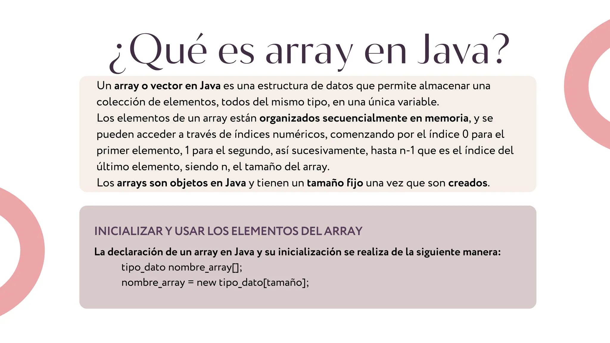 Un array en Java es una estructura de datos que almacena elementos del mismo tipo, accesibles por índices. Se declara y se inicializa de formas específicas, y se puede acceder y modificar sus elementos utilizando corchetes. Además, se pueden crear arrays multidimensionales, que permiten manejar colecciones de datos en múltiples dimensiones.