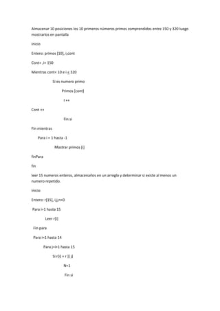 El documento describe dos algoritmos. El primero almacena los 10 primeros números primos entre 150 y 320 en un arreglo y luego los muestra. El segundo lee 15 números enteros, los almacena en un arreglo y determina si existe al menos un número repetido mostrando un mensaje si es así.