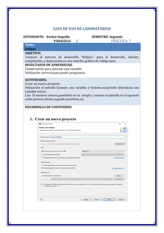 GUÍA DE USODE LABORATORIOS ESTUDIANTE: Evelyn Suquillo SEMESTRE: Segundo PARALELO: C PRÁCTICA: 7 TEMA: Eclipse OBJETIVO: Conocer el entorno de desarrollo “Eclipse”, para el desarrollo, edición, compilación, y depuración en una interfaz gráfica de código Java. RESULTADOS DE APRENDIZAJE. Comprensión para ejecutar una variable. Utilización correcta para poder programar. ACTIVIDADES: Crear un nuevo proyecto Utilización el método Scanner, sus variables y System.out.println (Introduzca una cantidad entera) Leer 10 números enteros,guardarlos en un arreglo y mostrar en pantalla en el siguiente orden primero,último,segundo,penúltimo,etc DESARROLLO DE CONTENIDOS 1. Crear un nuevo proyecto