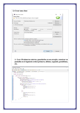 Este documento es una guía para una práctica de laboratorio sobre el uso de Eclipse para desarrollar aplicaciones Java. La práctica implica crear un proyecto en Eclipse, leer 10 números enteros usando Scanner, almacenarlos en un arreglo y mostrarlos en orden ascendente y descendente alternando.