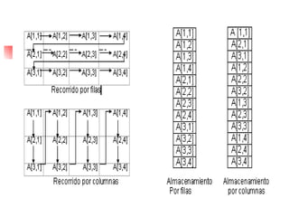 Este documento describe los arreglos bidimensionales o matrices. Explica que estos arreglos de dos dimensiones almacenan datos en forma de tablas con filas y columnas. Detalla cómo se declaran e inicializan las matrices indicando el tipo de datos, nombre, rangos de los subíndices fila y columna. Además, explica cómo manipular las matrices mediante bucles anidados para recorrerlas por filas o columnas y cómo acceder a sus elementos individuales.