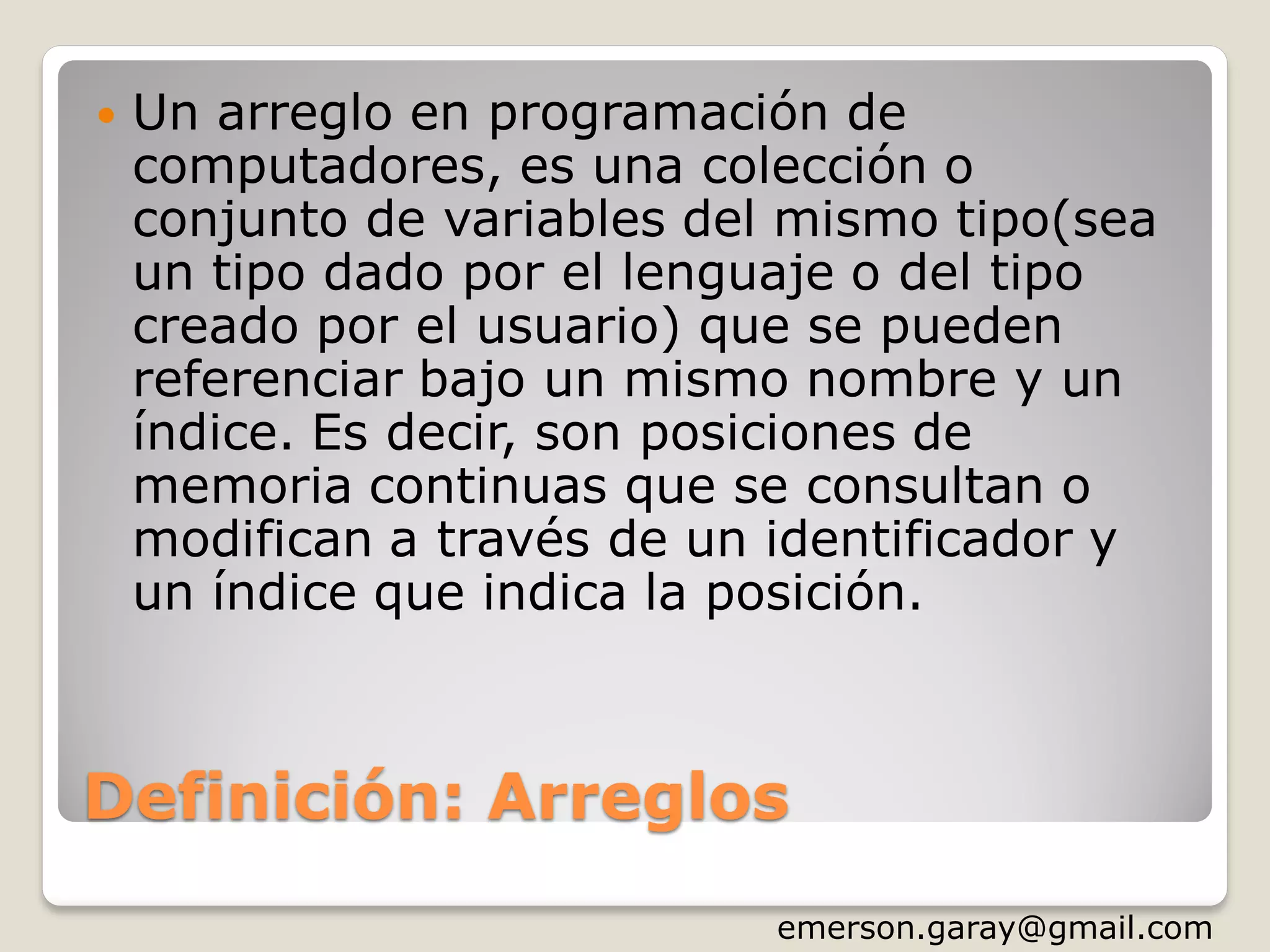 Este documento proporciona una introducción a los arreglos en Java. Explica que los arreglos son colecciones de variables del mismo tipo almacenadas de forma contigua en memoria y accesibles mediante índices. Describe tres tipos de arreglos: unidimensionales, bidimensionales y multidimensionales. Además, muestra ejemplos de cómo definir, crear, llenar y recorrer arreglos unidimensionales y bidimensionales en Java.