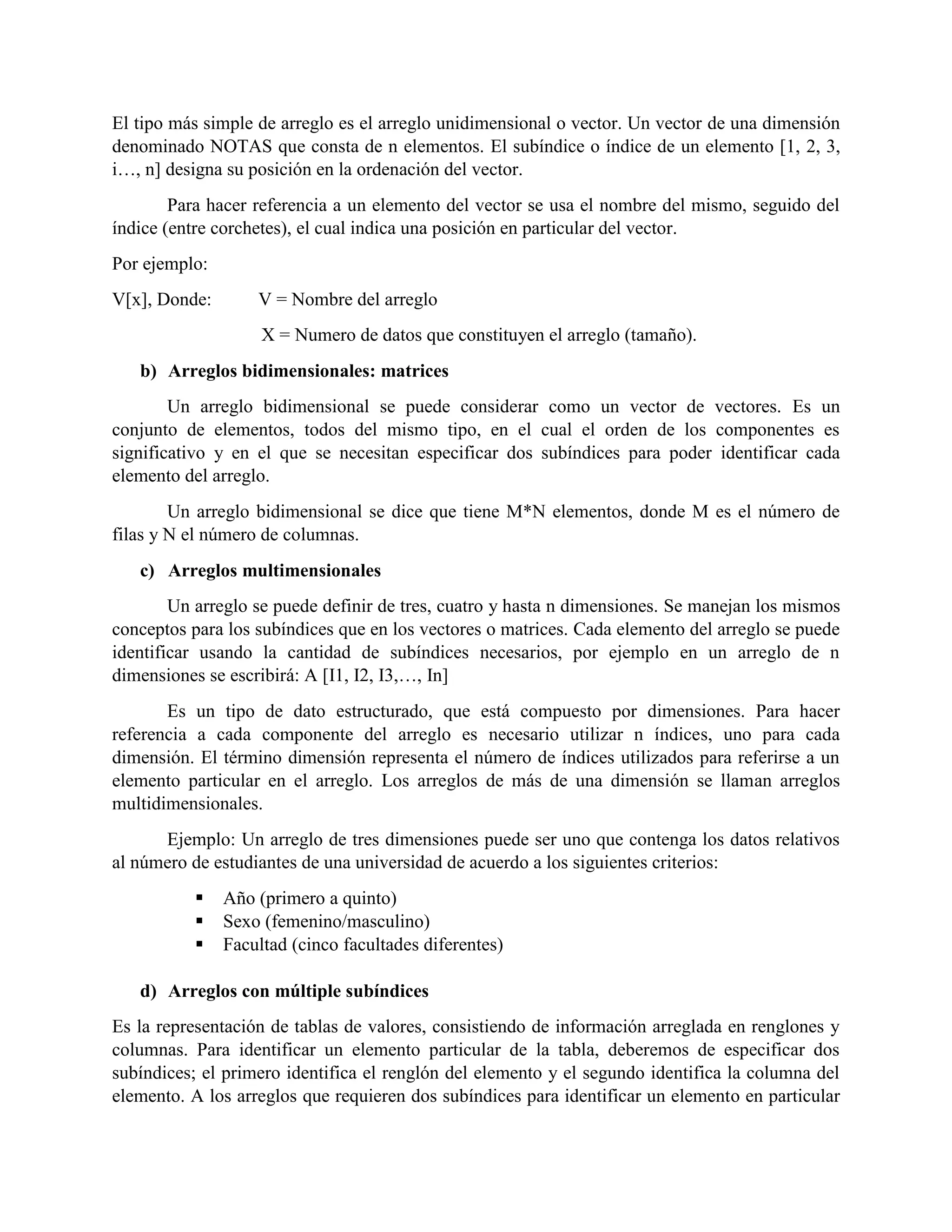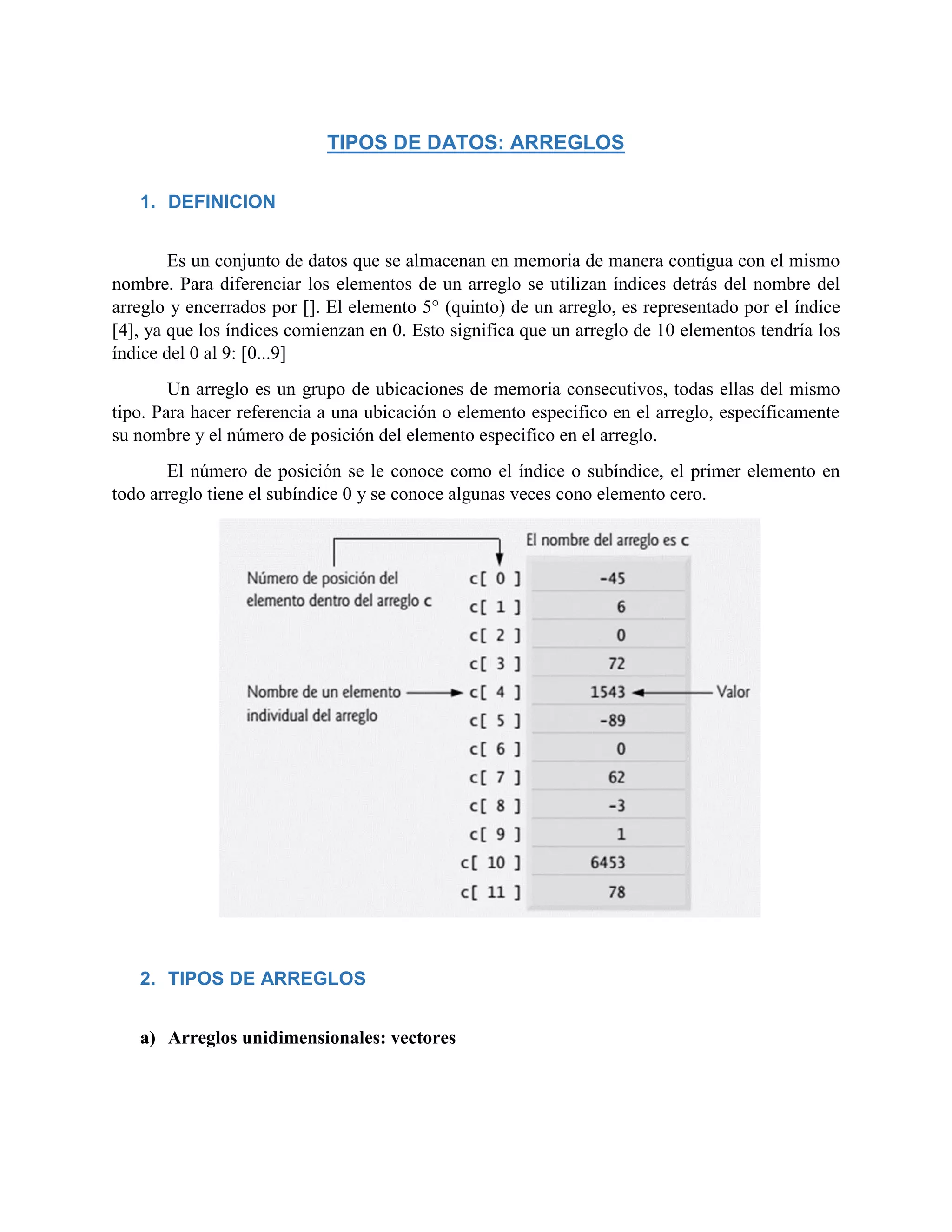El documento describe los tipos de datos arreglos, incluyendo su definición como un conjunto de datos almacenados de forma contigua con el mismo nombre. Explica que los arreglos pueden ser unidimensionales (vectores), bidimensionales (matrices) o multidimensionales, e identifica operaciones comunes como lectura, escritura, búsqueda y actualización. También compara métodos de búsqueda como la búsqueda lineal y la búsqueda binaria.