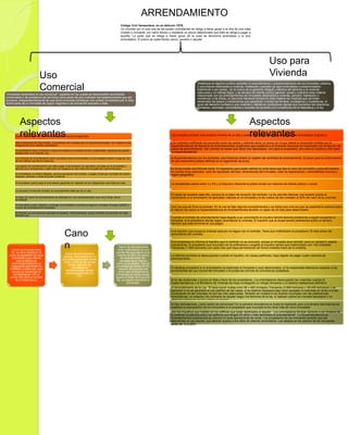 El documento describe las regulaciones sobre los arrendamientos de inmuebles en Venezuela. Establece que un arrendamiento es un contrato donde una parte se compromete a ceder el uso de un bien mueble o inmueble a cambio de un pago. Define los roles de arrendador y arrendatario y los tipos de cánones de arriendo. Además, detalla los derechos y obligaciones de ambas partes, como la duración mínima de los contratos, la fijación de los cánones y las causales para desalojos.