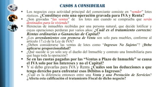 1) Las ventas de lotes rústicos constituyen una operación gravada para IVA y renta, incluso si serán destinados para vivienda.