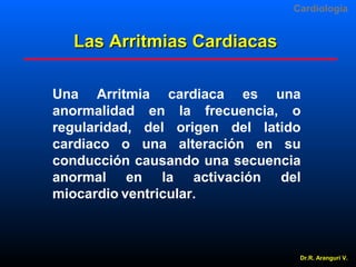 El documento aborda las arritmias cardíacas, explicando su diagnóstico y tratamiento mediante el análisis de mecanismos como la automaticidad y la reentrada. Se detallan diferentes tipos de arritmias, incluyendo taquicardias y bradicardias, así como sus implicaciones clínicas y electrocardiográficas. Además, se discuten tratamientos específicos y la importancia de la desfibrilación en casos de fibrilación ventricular.