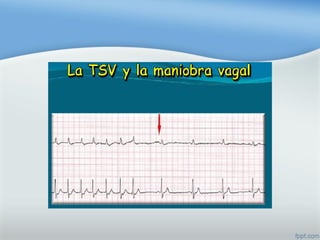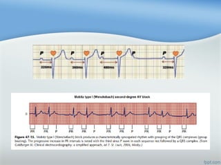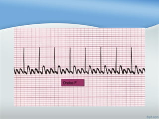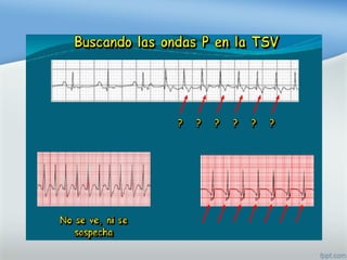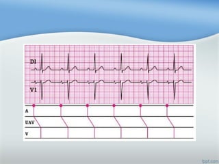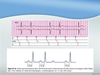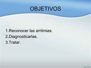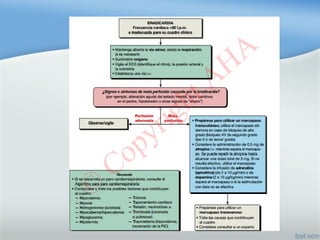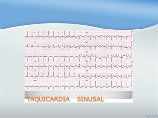 Este documento describe las diferentes arritmias cardiacas, incluyendo taquicardia sinusal, fibrilación auricular, extrasístoles ventriculares y diferentes tipos de bloqueos auriculoventriculares. Explica cómo identificar cada arritmia y los posibles tratamientos farmacológicos.