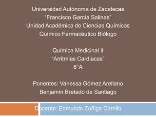 Este documento resume las arritmias cardiacas. Define las arritmias como variaciones del ritmo cardíaco causadas por trastornos del ritmo, la frecuencia o la conducción. Describe las principales causas y clasificaciones de las arritmias, incluyendo arritmias sinusales, auriculares, de la unión auriculoventricular y ventriculares. Explica los diagnósticos electrocardiográficos de diferentes tipos de arritmias como la taquicardia sinusal, la fibrilación auricular y las contracciones ventriculares pre