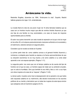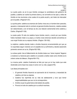 La novela narra la vida de Catalina, una joven de 15 años que se casa con el general Andrés Ascencio. Catalina sufre bajo el dominio opresivo y machista de su marido, quien la humilla y es infiel. Tras enamorarse de otro hombre y ver a su marido ordenar asesinatos, Catalina decide envenenar a Andrés para alcanzar la libertad que nunca tuvo durante su matrimonio. La novela expone la represión que vivían las mujeres en la época posrevolucionaria mexicana y cómo Catalina deja de ser