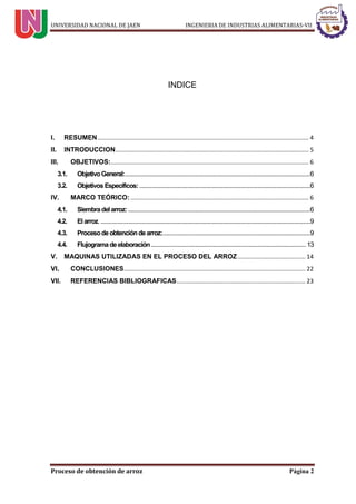 Este documento describe el proceso de obtención del arroz, incluyendo la siembra, cultivo, cosecha y procesamiento posterior. Explica las etapas de preparación del suelo, siembra, riego y cosecha del arroz, manual o mecánica. También identifica las máquinas utilizadas en cada etapa como cosechadoras y trilladoras. Finalmente, resume las etapas del procesamiento del arroz después de la cosecha como recepción, inspección, pesado, secado y otros procesos para su