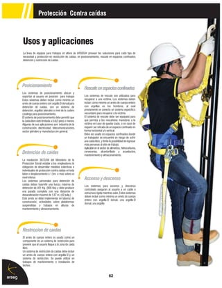 El documento describe una línea de equipos de protección contra caídas desarrollados por ARSEG de acuerdo con normas internacionales. Incluye sistemas para posicionamiento, rescate en espacios confinados, detención de caídas, restricción de caídas y ascenso/descenso. Se detallan 6 modelos de arneses diseñados para diferentes usos y sectores industriales.