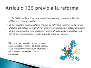 El documento aborda la regulación sobre la emisión de deuda pública y la estabilidad presupuestaria en España, enfatizando que el gobierno debe ser autorizado por ley para incurrir en déficit y deuda. Se menciona la reforma como respuesta a la crisis económica y la necesidad de ajustar la administración pública a los principios de estabilidad. Además, se detallan los procedimientos legislativos para las reformas constitucionales necesarias y la importancia de la adaptación de las comunidades autónomas a estas normativas.