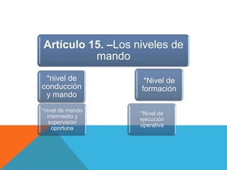 El documento presenta un proyecto de ley para el Código Orgánico de la Policía Nacional. Establece los diferentes niveles de mando y gestión dentro de la policía, así como los requisitos, procesos de selección, formación, ascensos y denuncias de corrupción para el personal policial. También define las funciones específicas de cada nivel y la necesidad de capacitación continua y especializada para los servidores públicos.