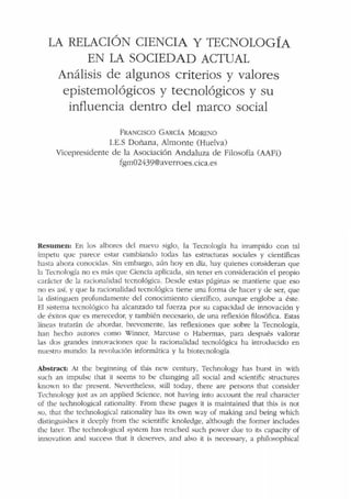 Este documento discute la relación entre la ciencia, la tecnología y la sociedad actual. En primer lugar, describe cómo la tecnología ha irrumpido con fuerza en los últimos años y parece estar transformando las estructuras sociales y científicas. Luego, argumenta que la racionalidad tecnológica tiene su propia forma de operar y ser, distinta del conocimiento científico aunque lo incluya. Finalmente, analiza brevemente las reflexiones de autores como Winner y Habermas sobre la tecnología y evalúa las innovaciones de la