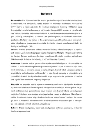 El documento explora la relación entre la inteligencia y la creatividad. Discute cinco hipótesis sobre esta relación, incluyendo que son constructos independientes o que la creatividad está dentro de la inteligencia. Presenta un estudio empírico que examina la relación entre la creatividad, la inteligencia general y las Inteligencias Múltiples. Los resultados indican bajas relaciones entre la creatividad y la inteligencia general, pero mayores relaciones entre la creatividad y algunas Inteligencias Múltiples como la visoespacial.