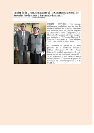 El director regional de educación de Lima Metropolitana inauguró el II Congreso Nacional de Escuelas Productoras y Emprendedoras 2011 en Santa Anita. El congreso se llevó a cabo del 8 al 10 de septiembre con el apoyo de la Dirección Regional de Educación de Lima Metropolitana y la UGEL 06. El director destacó la importancia de una educación inclusiva durante su discurso de apertura en la Institución Educativa Pública Parroquial No 101 "Shuji Kitamura", organizadora del evento.