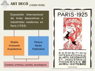 El documento describe el movimiento artístico Art Decó que floreció entre 1920-1930. Se caracterizó por el uso de formas geométricas como líneas, triángulos y círculos segmentados, así como por la ornamentación rica y los materiales novedosos. El estilo se aplicó a la arquitectura, diseño y artes decorativas en obras emblemáticas como el Edificio Chrysler y el Empire State Building en Nueva York.