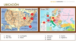 El documento describe el estilo Art Decó y su influencia en el mobiliario entre 1920-1940. Se originó en París en 1910 y se caracteriza por formas geométricas, aerodinámicas y asimétricas. Diseñadores notables como Ruhlmann, Chareau, Legrain y Follot crearon muebles elegantes con líneas curvas, patrones geométricos y materiales como metal, vidrio y madera lacada. El estilo representaba optimismo y prosperidad a través de diseños sensuales y modulares.