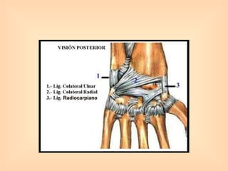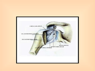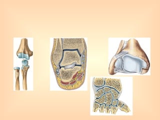 El documento describe diferentes tipos de articulaciones del cuerpo humano, incluyendo articulaciones fibrosas, cartilaginosas y sinoviales. Luego se enfoca en las articulaciones del miembro inferior, describiendo la articulación de la cadera, la rodilla y sus componentes anatómicos como la cápsula articular, ligamentos y meniscos. Finalmente, menciona brevemente los huesos del miembro superior y la articulación del hombro.