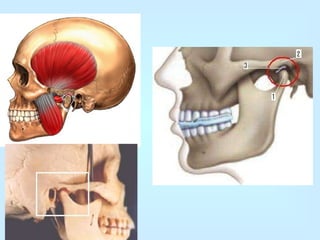 El documento presenta información sobre las articulaciones del cráneo y la articulación temporomandibular. Describe los diferentes huesos del cráneo, sus características y articulaciones, incluyendo el frontal, occipital, parietal, temporal y esfenoides. También describe la articulación temporomandibular, sus estructuras como el cóndilo de la mandíbula, la cavidad glenoidea y el disco articular.