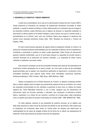 Este documento discute los impactos ambientales negativos que puede generar el desarrollo turístico en áreas rurales y propone formas de promover la sustentabilidad. Explica que el crecimiento del turismo debe compatibilizarse con la conservación ambiental para asegurar la experiencia recreativa, los recursos turísticos y la competitividad empresarial a largo plazo. También describe la importancia de evaluar los impactos ambientales de los proyectos turísticos según la legislación chilena para introducir criterios de protección paisajíst