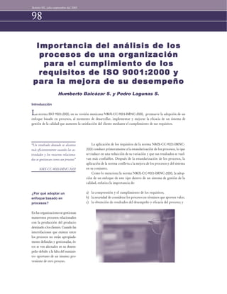 Este documento describe la importancia de realizar un análisis de los procesos de una organización para cumplir con los requisitos de ISO 9001:2000 y mejorar el desempeño. Explica que ISO 9001:2000 promueve un enfoque basado en procesos y describe los pasos para analizar un proceso, incluyendo definir su propósito, límites, entradas, salidas y actividades a través de un diagrama de flujo. También destaca que el análisis de procesos ayuda a identificar áreas de mejora y documentación