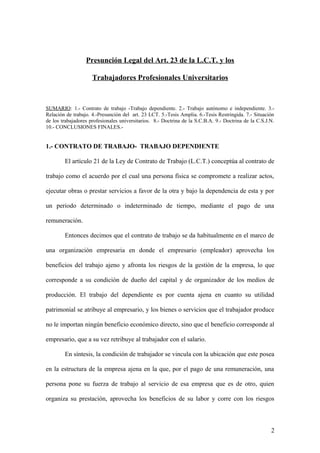 Este documento resume las diferentes posturas doctrinarias y jurisprudenciales sobre la aplicación de la presunción legal del artículo 23 de la Ley de Contrato de Trabajo a los trabajadores profesionales universitarios. Algunos sostienen que estos trabajadores deben probar estrictamente la dependencia laboral sin beneficiarse de la presunción, mientras que otros argumentan que la ley no establece excepciones y la presunción debe aplicarse a todos por igual. Finalmente, se concluye que cada caso debe evaluarse individualmente considerando los elementos de depend