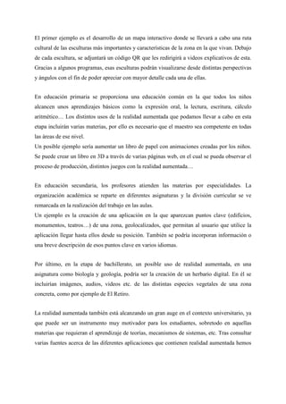 Este documento describe las aplicaciones de la realidad aumentada en la educación en diferentes niveles. Explica que la realidad aumentada combina lo real con lo virtual a tiempo real usando dispositivos como teléfonos. Luego propone ejemplos como mapas interactivos con códigos QR en educación infantil, libros 3D creados por niños en primaria, y aplicaciones con puntos de interés geolocalizados en secundaria. Finalmente, analiza herramientas de realidad aumentada como LearnAR, Magic Book y un laboratorio de física virtual para la educ