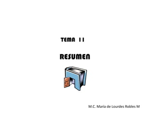 Este documento ofrece instrucciones sobre cómo escribir un resumen. Señala que un resumen debe contener la información fundamental del artículo en 3 oraciones o menos, sin incluir citas ni referencias a otros elementos. Debe permitir entender el artículo sin necesidad de consultar el texto original, recapitulando brevemente la introducción, objetivos, métodos, resultados, discusión y conclusiones del documento original.
