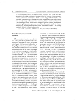 El documento describe cómo el consumo de sustancias es un problema de salud pública importante entre los adolescentes en España. Se ha observado un aumento en el consumo de cannabis y una reducción en problemas relacionados con drogas ilegales graves. Sin embargo, el consumo de alcohol y tabaco sigue siendo común. El consumo de sustancias a menudo ocurre en grupos de pares durante el tiempo libre y los fines de semana, cuando los adolescentes pasan más tiempo con amigos que con la familia. La investigación sugiere que la calidad de la relación con los amigos y el tipo de grupo al