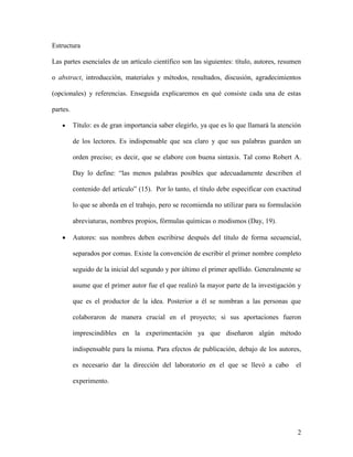 El documento define un artículo científico como un documento que difunde los resultados de una investigación de manera clara y precisa. Explica que un artículo científico sirve para informar los resultados de una investigación científica y fomentar el desarrollo de métodos experimentales innovadores. Además, describe las partes esenciales de un artículo científico como el título, autores, resumen, introducción, materiales y métodos, resultados, discusión y referencias.