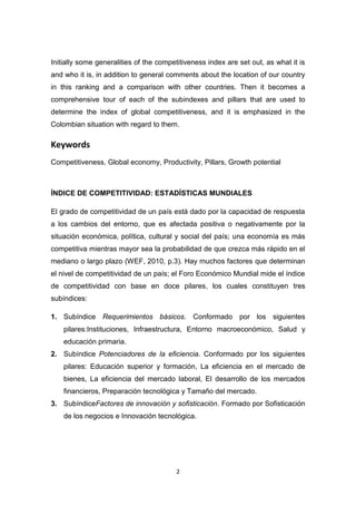 Este documento resume el índice de competitividad global de Colombia según el Informe de Competitividad Global 2010-2011 del Foro Económico Mundial. Colombia ocupó el puesto 68 a nivel mundial con una calificación de 4.14. Dentro de América Latina y el Caribe, Colombia se ubicó noveno. El documento analiza los pilares y subíndices que determinan la competitividad de un país, destacando las fortalezas y debilidades de Colombia. Finalmente, revisa detalladamente la situación de Colombia en cada uno de