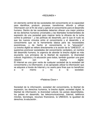 El documento discute el paso de las sociedades de la información a las sociedades del conocimiento, donde la identificación, producción y uso de información para crear conocimiento es fundamental para el desarrollo humano. También aborda la importancia de los derechos humanos y la libertad de expresión en estas sociedades, así como los desafíos de la brecha digital entre países desarrollados y en desarrollo. El acceso a Internet es clave para el éxito de las sociedades del conocimiento.