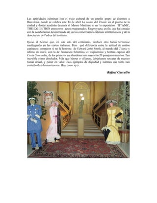 El documento resume el hundimiento del Titanic hace 100 años y las actividades planeadas por un instituto español para conmemorar el aniversario. En 1912, el Titanic se hundió en el Atlántico Norte después de chocar contra un iceberg, matando a casi 1,500 personas. Un siglo después, los investigadores creen que el desastre se podría haber evitado si el barco hubiera navegado más despacio o desviado el choque. El instituto ha recreado parte del Titanic y organizó un viaje a Barcelona para ver exposiciones sobre el n