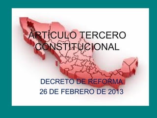 El documento describe las disposiciones constitucionales sobre educación en México. Establece que la educación impartida por el Estado deberá desarrollar las facultades humanas y fomentar valores como el amor a la patria y los derechos humanos. Toda persona tiene derecho a recibir educación básica obligatoria impartida por el Estado. Se crea un sistema de evaluación educativa y un instituto autónomo encargado de evaluar la calidad del sistema educativo nacional.