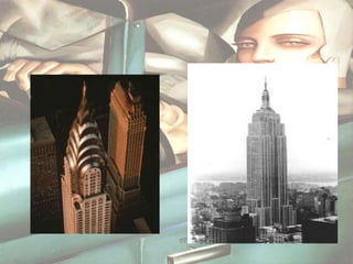 El Art Deco fue un estilo artístico que se desarrolló entre 1920 y 1939, caracterizado por formas geométricas y motivos inspirados en Egipto y Grecia. Alcanzó su máximo esplendor en la Exposición Internacional de París de 1925. Se dividió en los Felices Años 20 y los Tristes Años 30, marcados por la Gran Depresión luego del crash bursátil de 1929. Personajes emblemáticos de la época incluyen a Greta Garbo, Al Capone y Carlos Gardel.