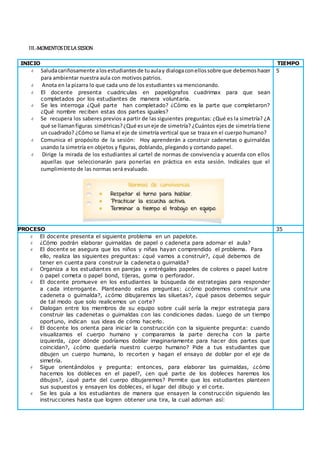 Este documento presenta los detalles de una sesión de aprendizaje sobre simetría y la creación de guirnaldas y cadenas de papel para decorar un aula. La sesión se divide en momentos como la introducción, el proceso, y la conclusión. Los estudiantes aprenderán a identificar ejes de simetría, doblar y cortar el papel de manera simétrica, y evaluarán su progreso y aprendizaje.