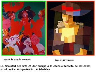 Este documento contiene una recopilación de citas de diferentes artistas, filósofos y pensadores sobre el arte y su importancia. Algunas de las ideas expresadas son que el arte es una forma de ver el alma a través de la inspiración y no solo copiar la apariencia; que sin el arte la vida sería un error; y que el arte perturba mientras que la ciencia tranquiliza.