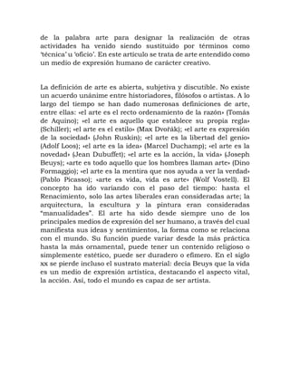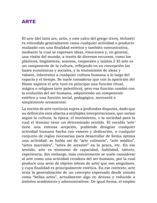 El documento define el arte como cualquier actividad o producto creado con una finalidad estética y comunicativa para expresar ideas, emociones y visiones del mundo. Explica que la noción de arte ha evolucionado a lo largo del tiempo y sigue siendo objeto de debate, aunque generalmente se considera al arte como una actividad creativa humana que produce obras singulares con una finalidad principalmente estética. Resume algunas definiciones históricas de arte y explica que en la antigüedad clásica el término se aplicaba a cualquier habilidad product