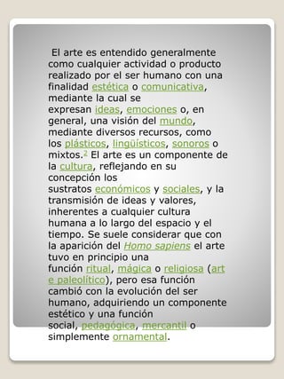 El arte se entiende generalmente como cualquier actividad o producto creado por el ser humano con una finalidad estética o comunicativa para expresar ideas, emociones o una visión del mundo a través de recursos plásticos, lingüísticos, sonoros o mixtos. El arte refleja la cultura, incluyendo los aspectos económicos y sociales así como la transmisión de ideas y valores de una cultura a lo largo del tiempo y el espacio. Originalmente, el arte tuvo una función ritual, mágica o religiosa cuando apareció el H