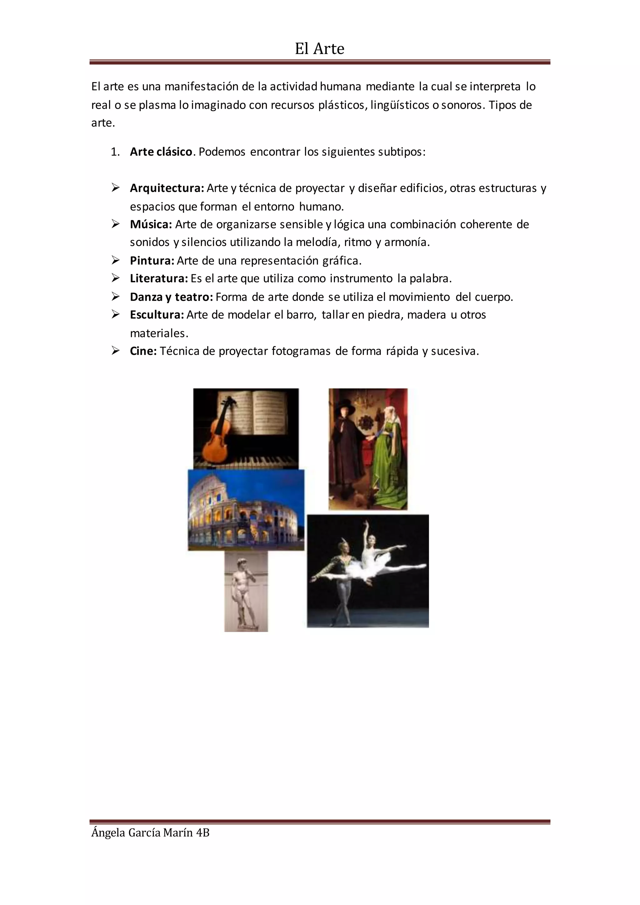 El documento describe los diferentes tipos de arte, incluyendo el arte clásico como la arquitectura, música, pintura, literatura, danza y teatro, y escultura. También describe el arte moderno, con subtipos como el arte povera, pintura de acción, el happening, arte digital, body art, arte conceptual y arte genético. El arte se define como una manifestación humana para interpretar la realidad o plasmar lo imaginado usando recursos plásticos, lingüísticos o sonoros.