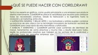 CorelDRAW es un software de diseño gráfico vectorial que ofrece herramientas para ilustración, diseño de páginas, tipografía, color, estilos, vectorización asistida por IA, edición no destructiva, búsqueda y reemplazo, compatibilidad con archivos y tabletas táctiles. Viene en opciones de suscripción mensual o anual y siempre incluye actualizaciones y asistencia.